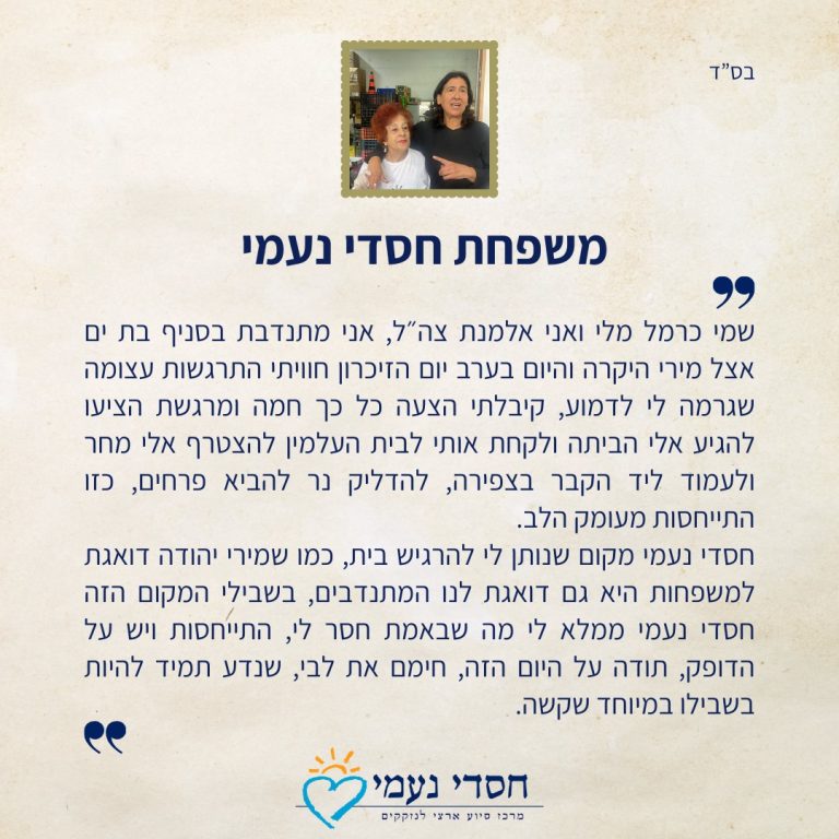 ״כזו התייחסות מעומק הלב,״ מספרת כרמל. ״חסדי נעמי הוא מקום שנותן לי תחושת בית. מירי לא רק דואגת למשפחות, אלא גם לנו, המתנדבים. המקום הזה ממלא לי את מה שחסר – התייחסות, תשומת לב ותחושת שייכות.״