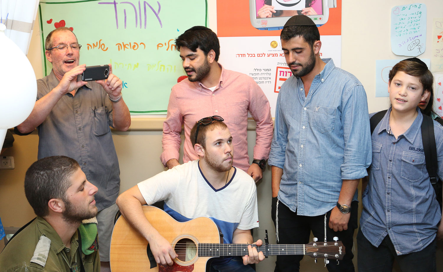 במשך מספר שעות, הסתובבו המתנדבים בין המחלקות השונות, פגשו את החיילים, שמעו מהם חוויות משדה הלחימה ועודדו את רוחם עם משלוח מתוק ומכתבים שהביאו המתנדבים. המתנדבים שרו יחד שירי נשמה, ביניהם "וזכני לגדל", "גשר צר מאד" ושירים משמחים גם יותר- "עם ישראל חי", "מי שמאמין לא מפחד", ולא התפשרו על שירה בשתי קולות ועל ליווי מוסיקלי של נגן הגיטרה טל ברק שהצטרף אליהם.