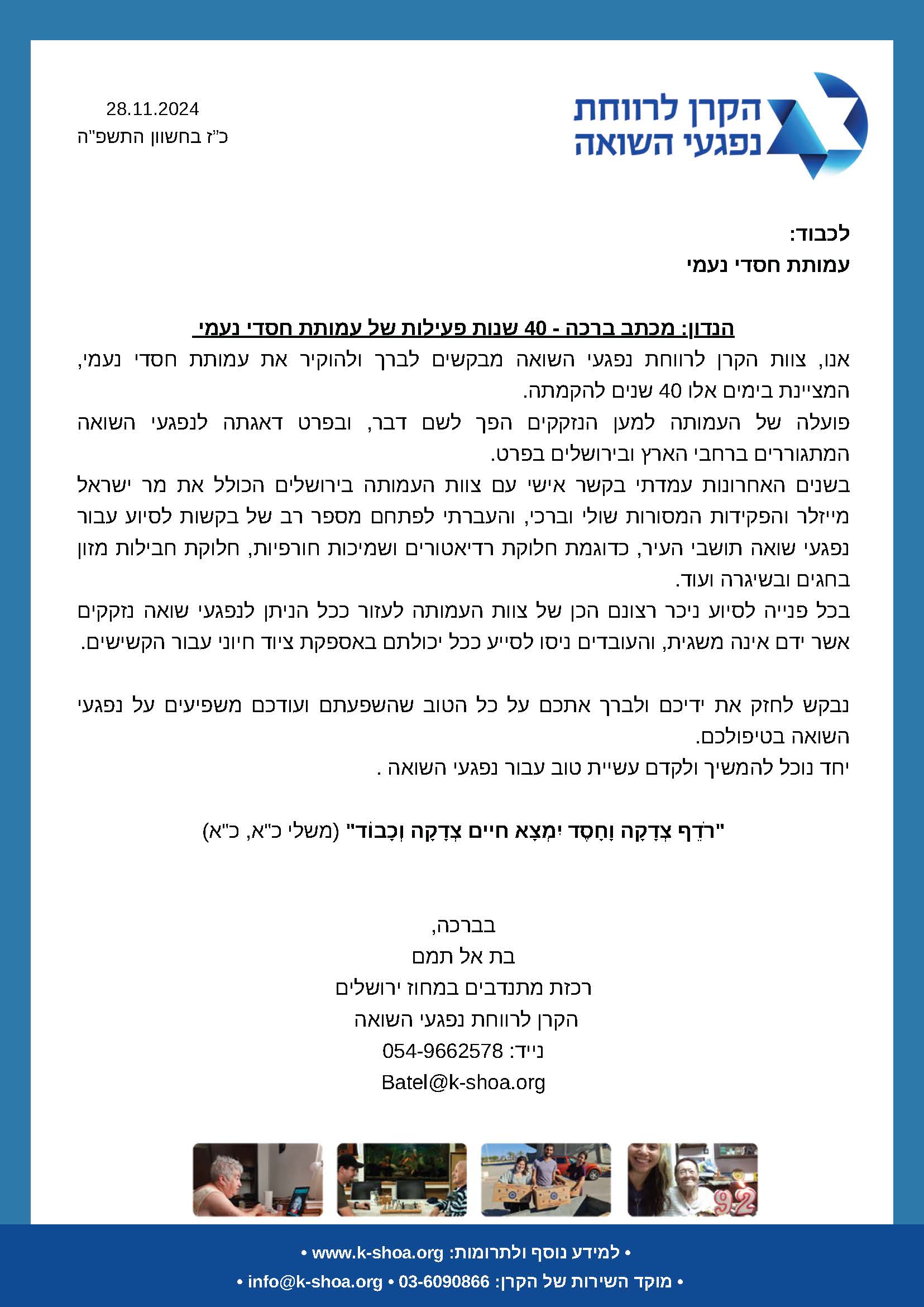 מכתב ברכה מהקרן לרווחת ניצולי השואה לרגל 40 שנות פעילות של עמותת חסדי נעמי